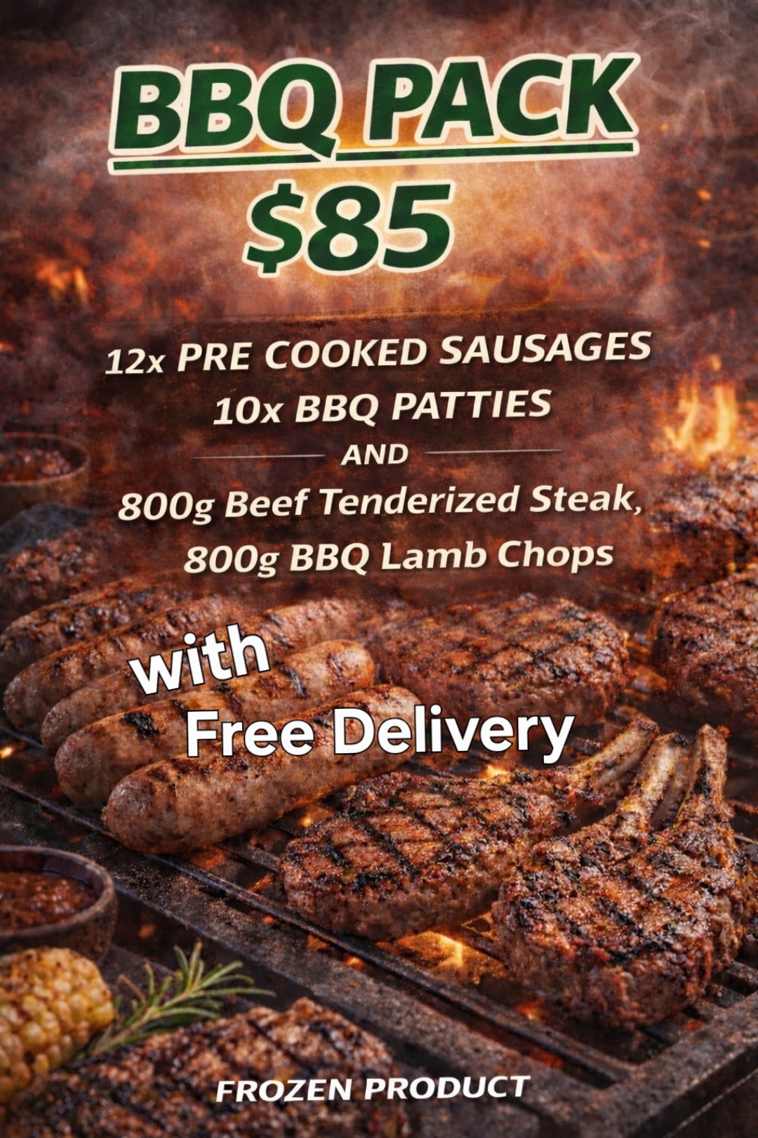 Absolute Meats BBQ Pack, 12x Pre-Cooked Sausages – 10x BBQ Patties – 800g BBQ Beef Tenderized Steak – 800g BBQ Lamb Chops.